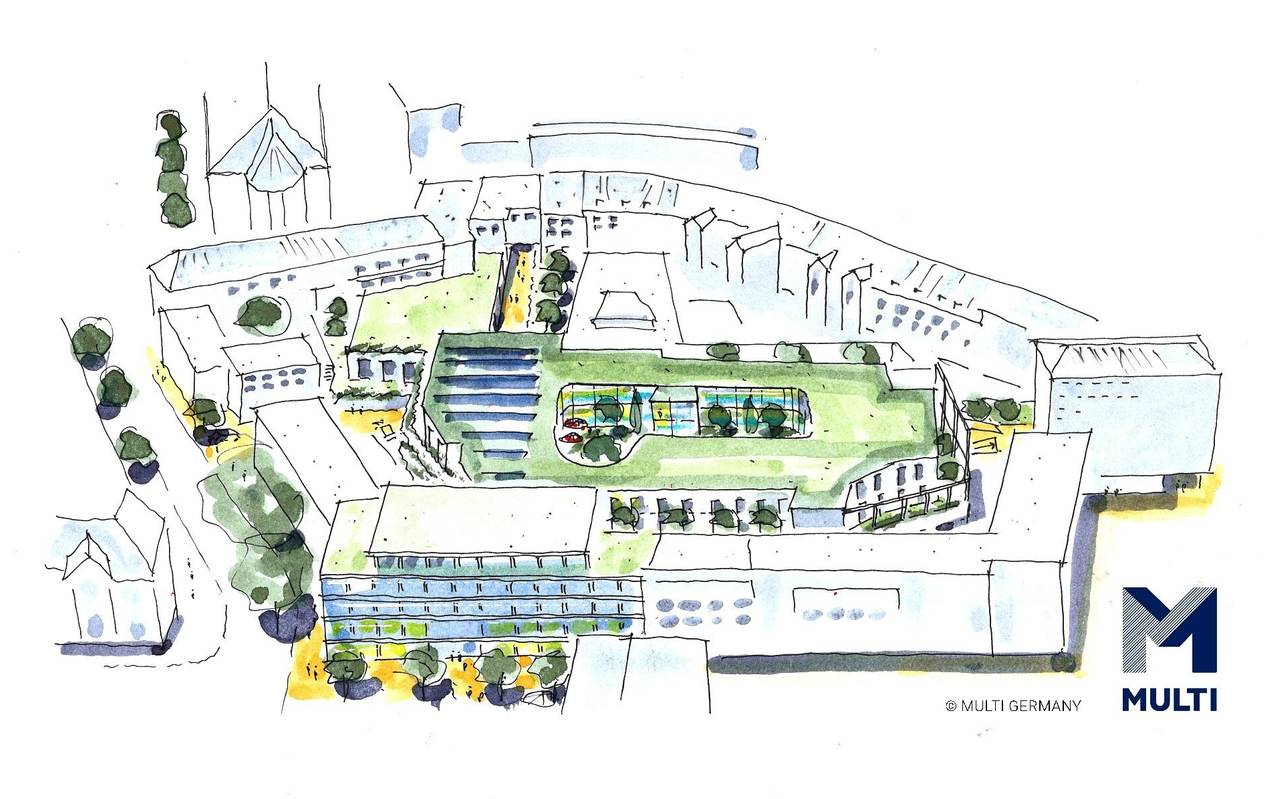 Die aktuellen Pläne für das leerstehende Einkaufszentrum sehen weniger Einzelhandel, mehr Wohnen und Grün vor. Ein offener Innenhof soll für Tageslicht sorgen.
