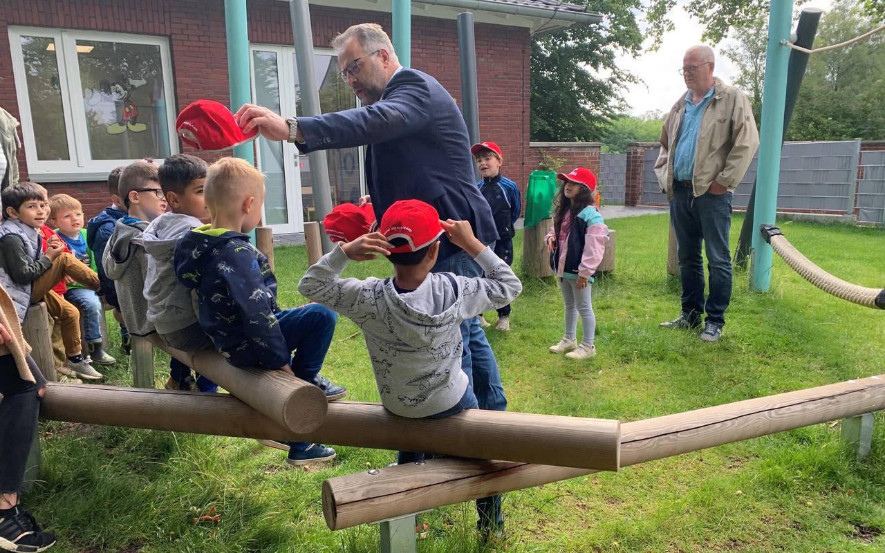 Alle Vorschulkinder in Bottrop bekommen noch vor den Sommerferien eine Warnmütze geschenkt. Damit sollen Autofahrer die Kinder im Straßenverkehr besser sehen. Heute Vormittag wurden die ersten Sicherheitskappen verteilt und zwar an die zukünftigen Schulanfänger der Kita Ratz und Rübe in der Rheinbabenstraße im Eigen. Mit dabei ist auch Oberbürgermeister Bernd Tischler. Er ist der Schirmherr der Aktion.