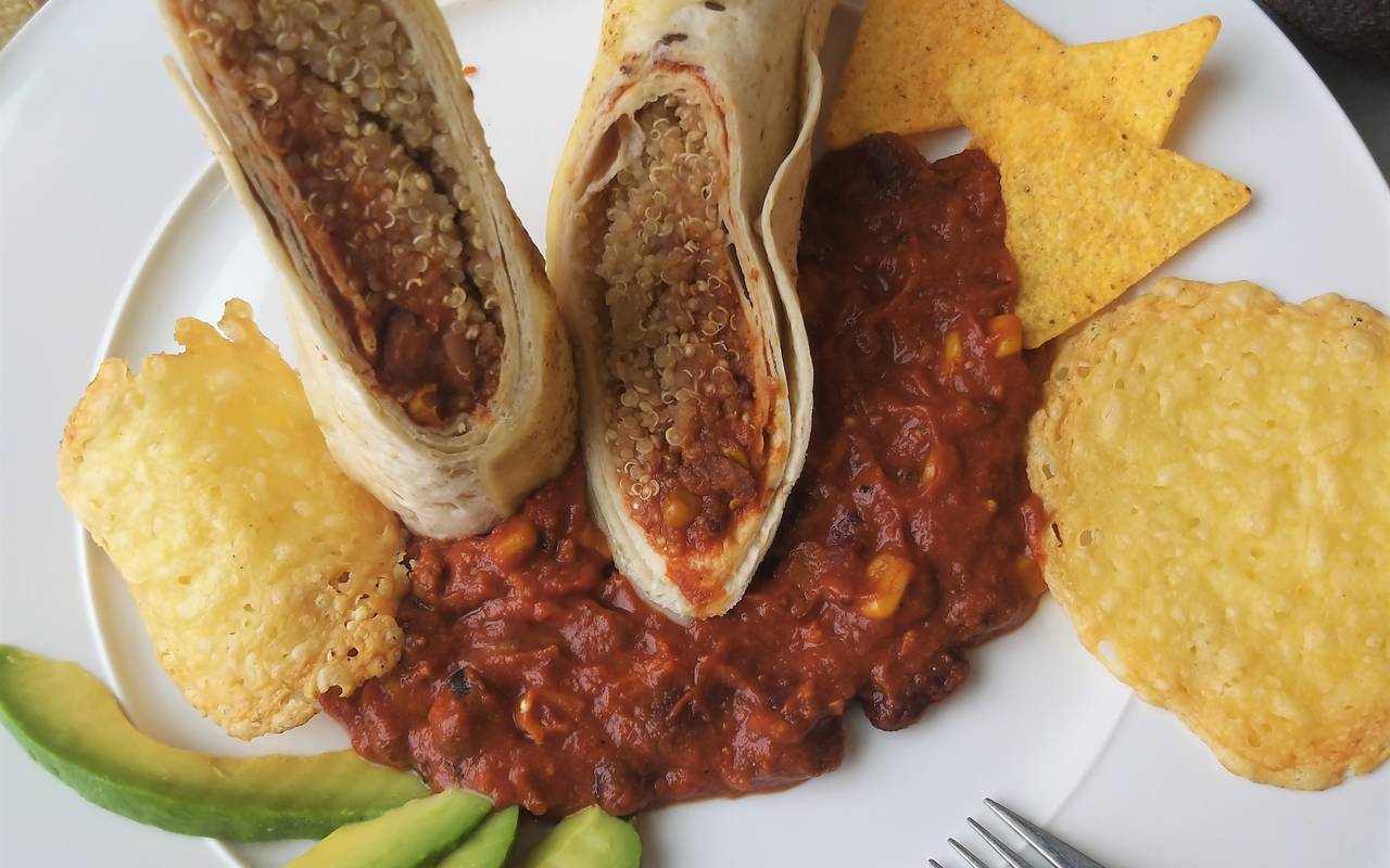 - Das fertige Getreide mit etwas Chili con Carne in einer Tortilla einrollen mit Käse belegen und bei 200 ° C im Ofen backen .
