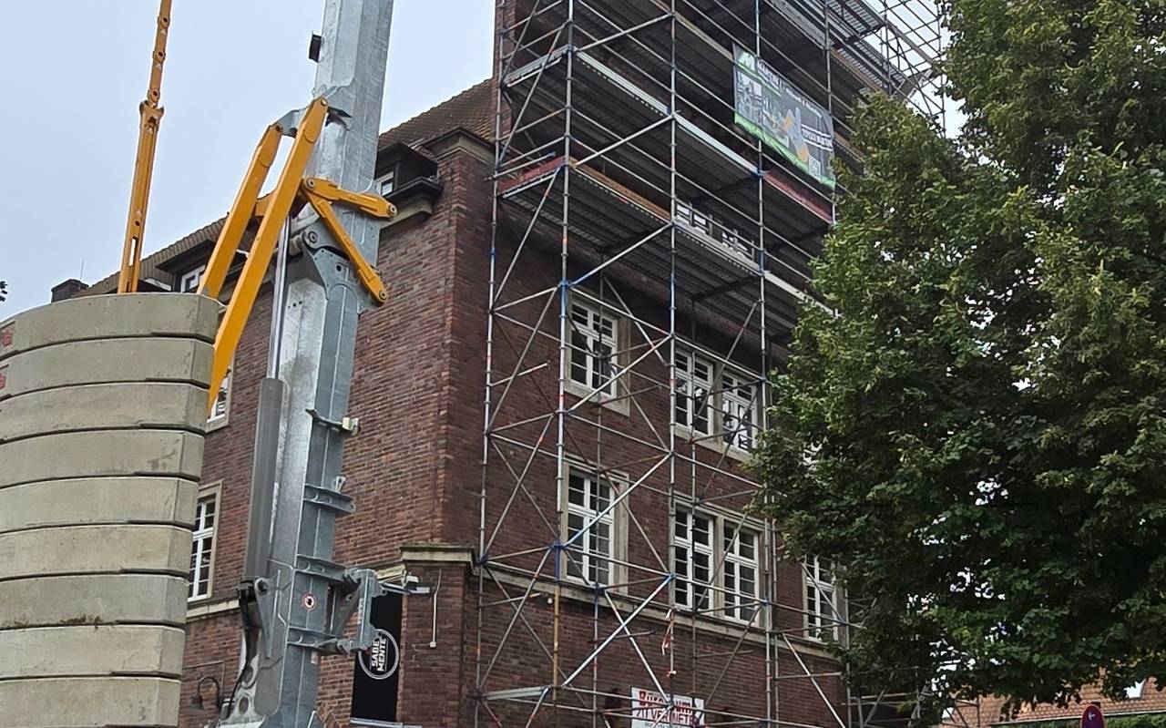Im August musste es abgesperrt werden, weil die Giebelwand einzustürzen drohte. In dem ehemaligen Bundesbank-Gebäude befinden sich unter anderem ein Restaurant und mehrere Büros. Das Restaurant ist jetzt wieder geöffnet - vorher hatte der Eigentümer des Gebäudes den Giebel abgestuft und damit gesichert. In Absprache mit der Denkmalbehörde wird in den kommenden Tagen noch die Figur an der Giebelwand abgenommen. Danach sollen auch die Absperrungen und das Gerüst gegenüber vom Buerschen Busbahnhof verschwinden. Komplett beendet sein sollen die Bauarbeiten Ende November.
