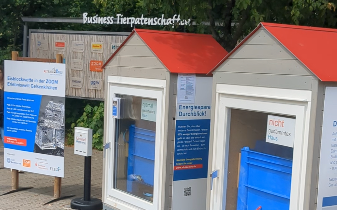In der ZOOM Erlebniswelt in Gelsenkirchen startet heute die Eisblockwette. Dabei stehen zwei Wochen lang zwei mit 230 Liter Eis befüllte kleine Häuser im Zentrum. Eines davon ist mit modernen Techniken isoliert, das andere nicht. Als Zoo-Besucher könnt ihr wetten, wie viel Eis am Aktionsende in beiden Häusern übrig ist und Preise gewinnen. Mit der Eisblockwette wollen Stadt und ZOOM-Erlebniswelt zeigen, wie viel Energie wir sparen können, wenn unsere Häuser vernünftig gedämmt sind. Ein gut gedämmtes Haus lohnt sich aber nicht nur für den Geldbeutel, sondern auch für das Klima.