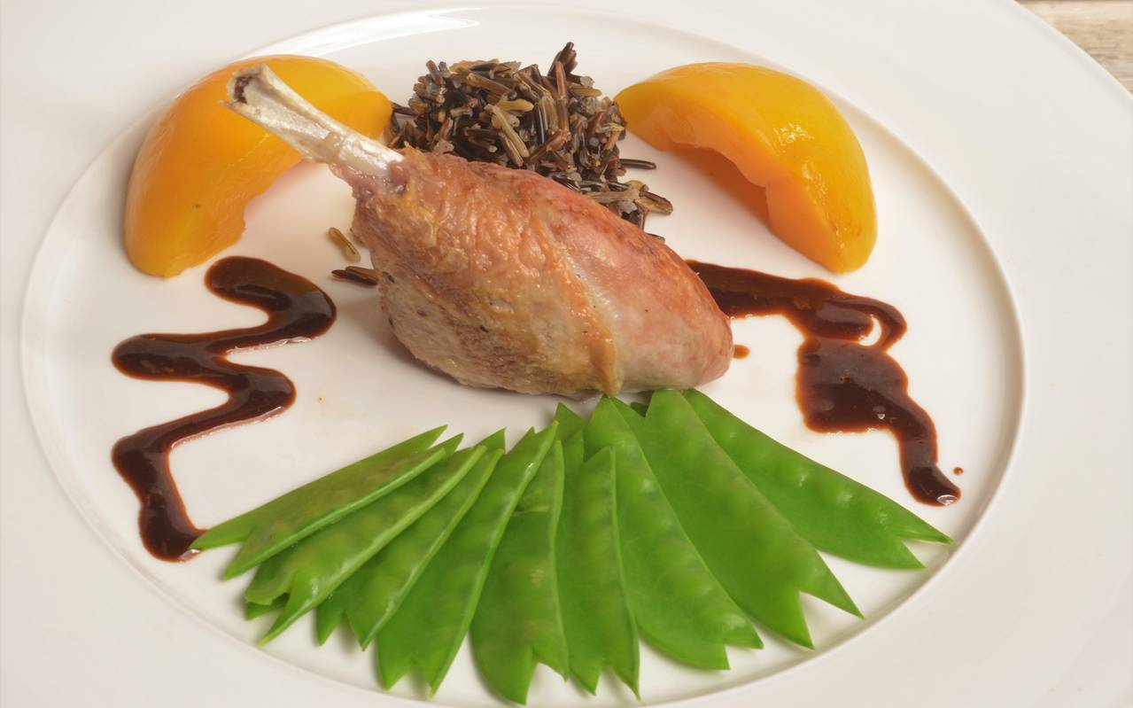 Entenkeule mit schwarzem Reis und Pfirsichen mit Kaiserschoten