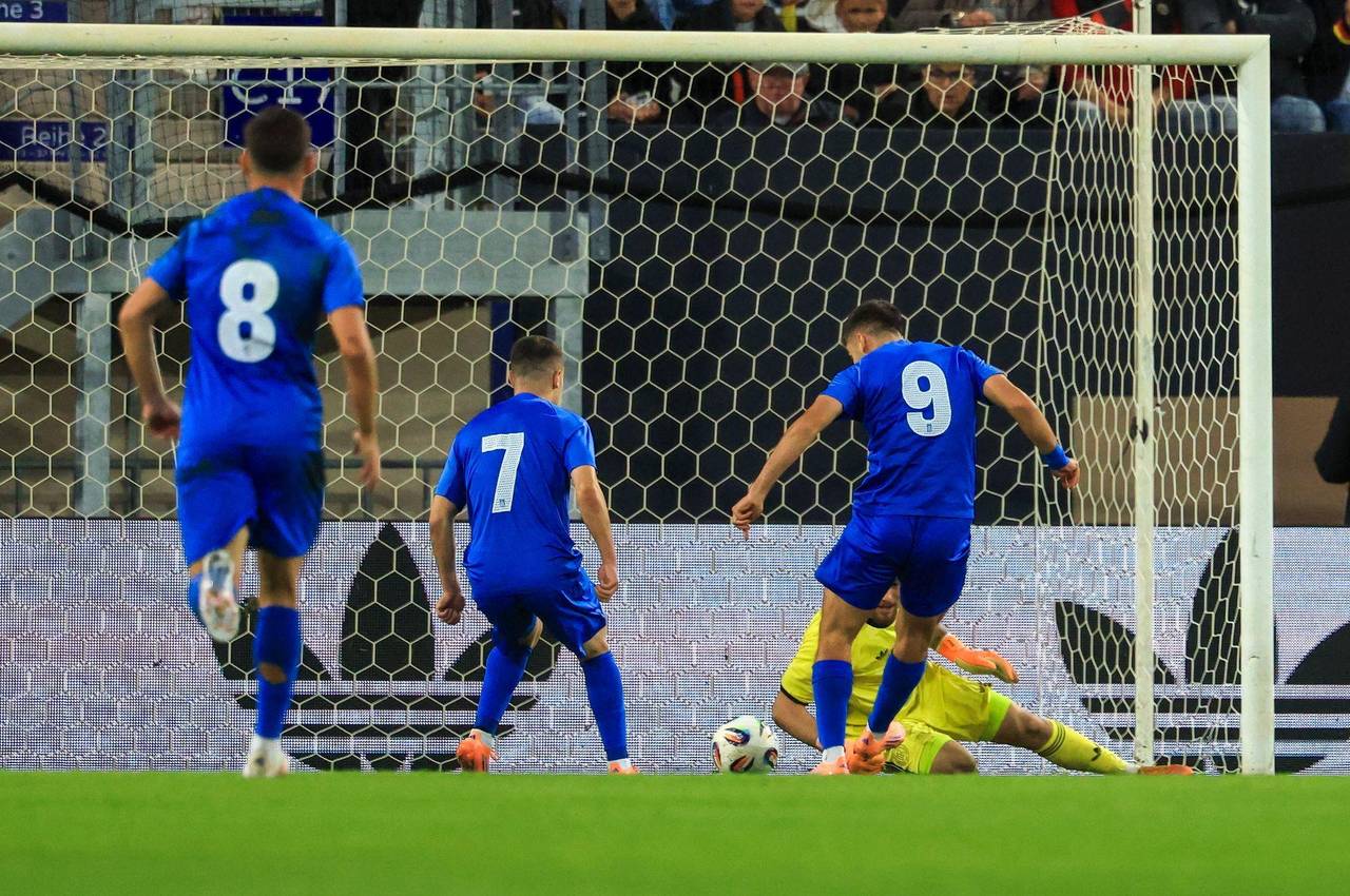 Nach einem Blackout von Torhüter Dennis Seimen erhöht Griechenland auf 2:0.© Jan Woitas/dpa