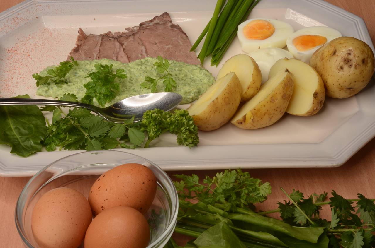 Für die Frankfurter Soße benötigt man eine ganze Reihe von Kräutern: Petersilie, Pimpernelle, Kerbel, Kresse, Sauerampfer, Boretsch und Schnittlauch, die fein zu wiegen sind. Dazu kommt noch gehacktes Ei nach „Omas Rezept“. Bei der Frankfurter Grünen Soße handelt es sich um eine kalte Sauce. Sie wird in allen Teilen Hessens in verschiedener Weise zubereitet, aber immer mit gehacktem Ei Joghurt und den frisch gehackten Kräutern. Die Frankfurter Grüne Sauce schmeckt zu kaltem Braten, Suppenfleisch und Fisch. Dieser Klassiker aus Hessen hat im Frühling und Sommer Saison. Denn gerade als kaltes Gericht passt es hervorragend in die warme Jahreszeit.