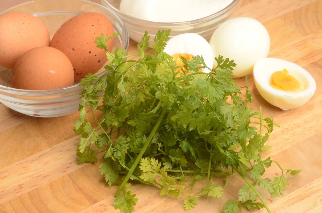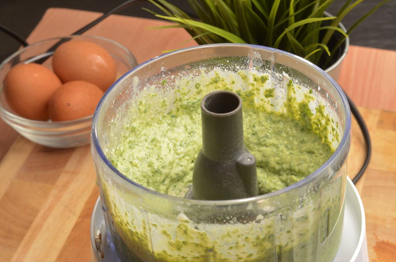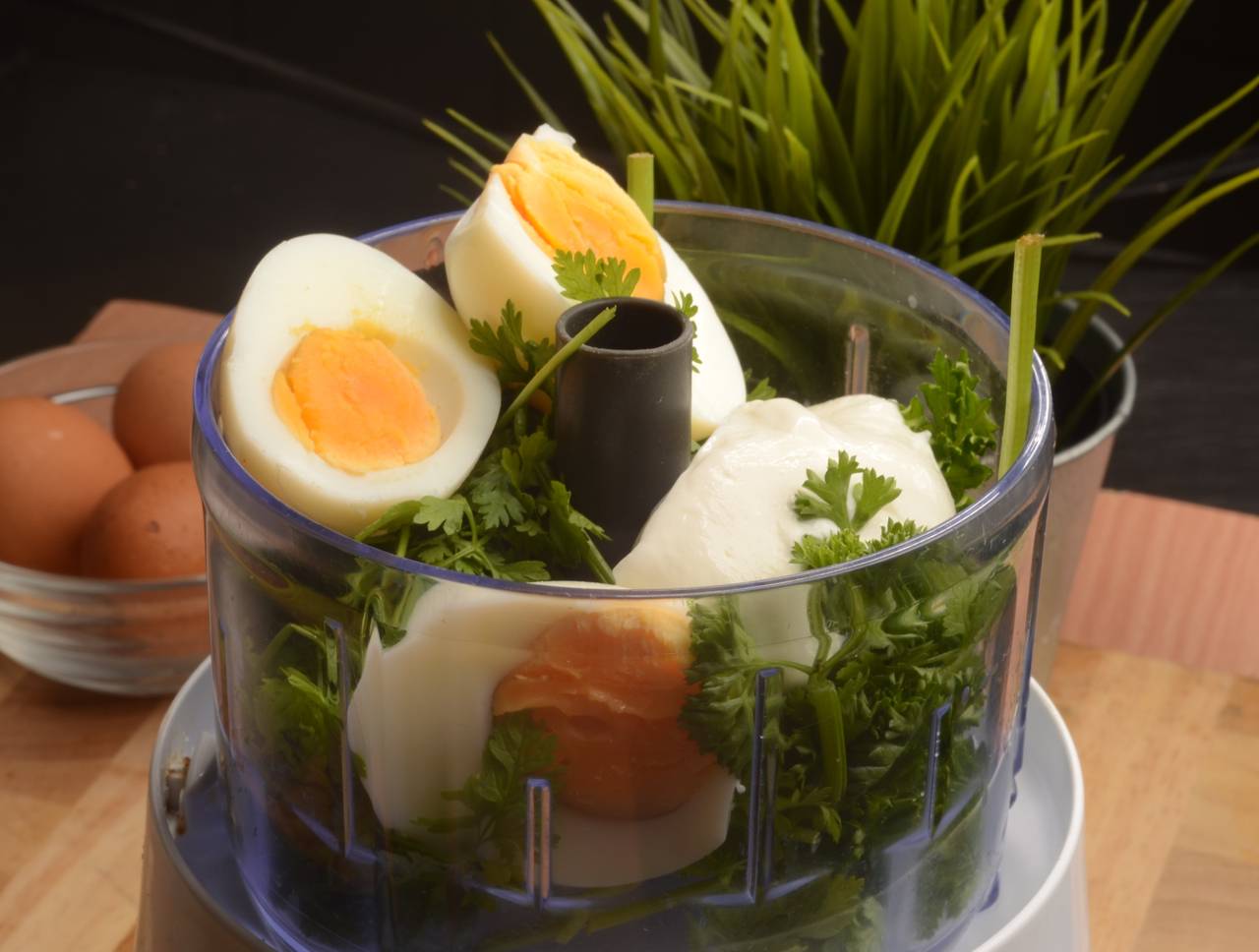 Eier hart kochen, abschrecken, pellen und hacken. Kräuter gegeben falls waschen und trockenschleudern. Blätter fein hacken, wenn vorhanden in einer Küchenmaschine. Zwiebel fein würfeln.