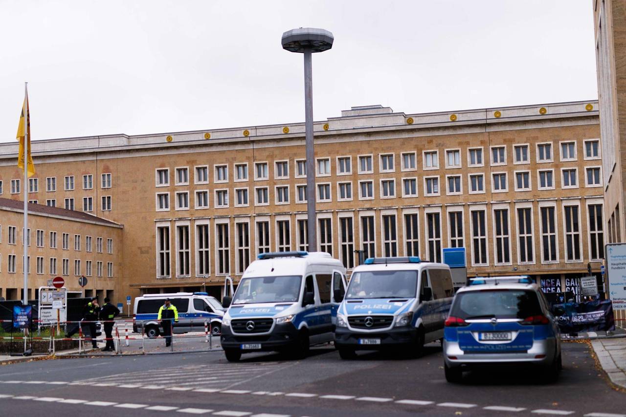 Die Polizei steht vor dem Zugang zu der Ausstellung "Nova Music Festival Exhibition" im ehemaligen Flughafen Tempelhof. © Carsten Koall/dpa