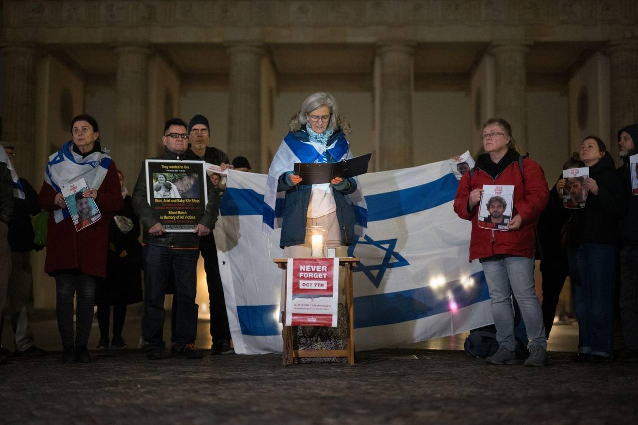 Menschen erinnern am Brandenburger Tor an die Opfer des 7. Oktober.