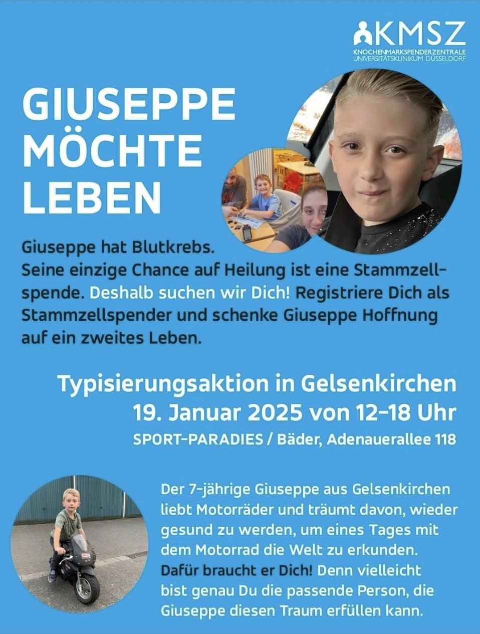 Ein siebenjähriger Junge aus Gelsenkirchen braucht dringend eure Unterstützung: Der kleine Giuseppe ist an Blutkrebs erkrankt und auf eine lebensrettende Stammzellenspende angewiesen. Um einen passenden Spender zu finden, gibt es am kommenden Sonntag eine Typisierungsaktion. Wer helfen möchte, kann ins Gelsenkirchener Sportparadies an der Adenauerallee kommen. Da könnt ihr euch zwischen 12 und 18 Uhr als potenzielle Stammzellenspender registrieren lassen. Die Teilnahme ist ganz einfach: Mit einem einfachen Wangenabstrich per Wattestäbchen seid ihr dabei. Wichtig: Ihr solltet gesund und zwischen 17 und 55 Jahre alt sein.