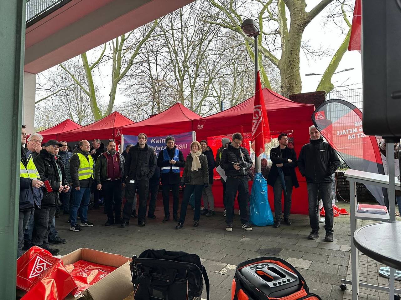 Auf dem Schalker Markt läuft gerade eine Betriebsversammlung mit rund 100 Mitarbeitern des Autozulieferers. Sie wollen um ihre Jobs kämpfen.
