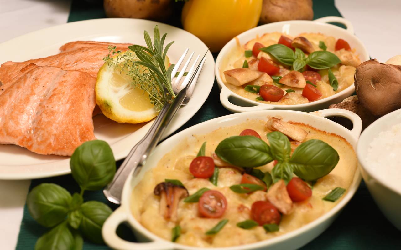 Gnocchi-Auflauf mit Kräutersaitlingen und Lachsfilet