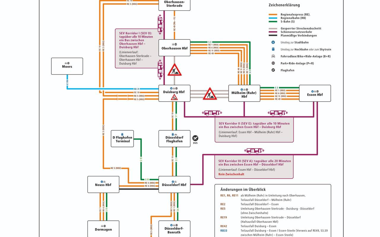 Wegen einer neuen Großbaustelle der Bahn gibt es in drei Wochen einige Fahrplanänderungen zwischen Essen und Düsseldorf. Ab dem Gelsenkirchener Hauptbahnhof sind die Linien RE2, RE3 und RE 42 betroffen. Für Pendler in Bottrop gibt es Probleme beim RE44. Auf den betroffenen Linien gibt es streckenweise Zugausfälle, Umleitungen - oder ihr müsst in Ersatzbusse umsteigen.