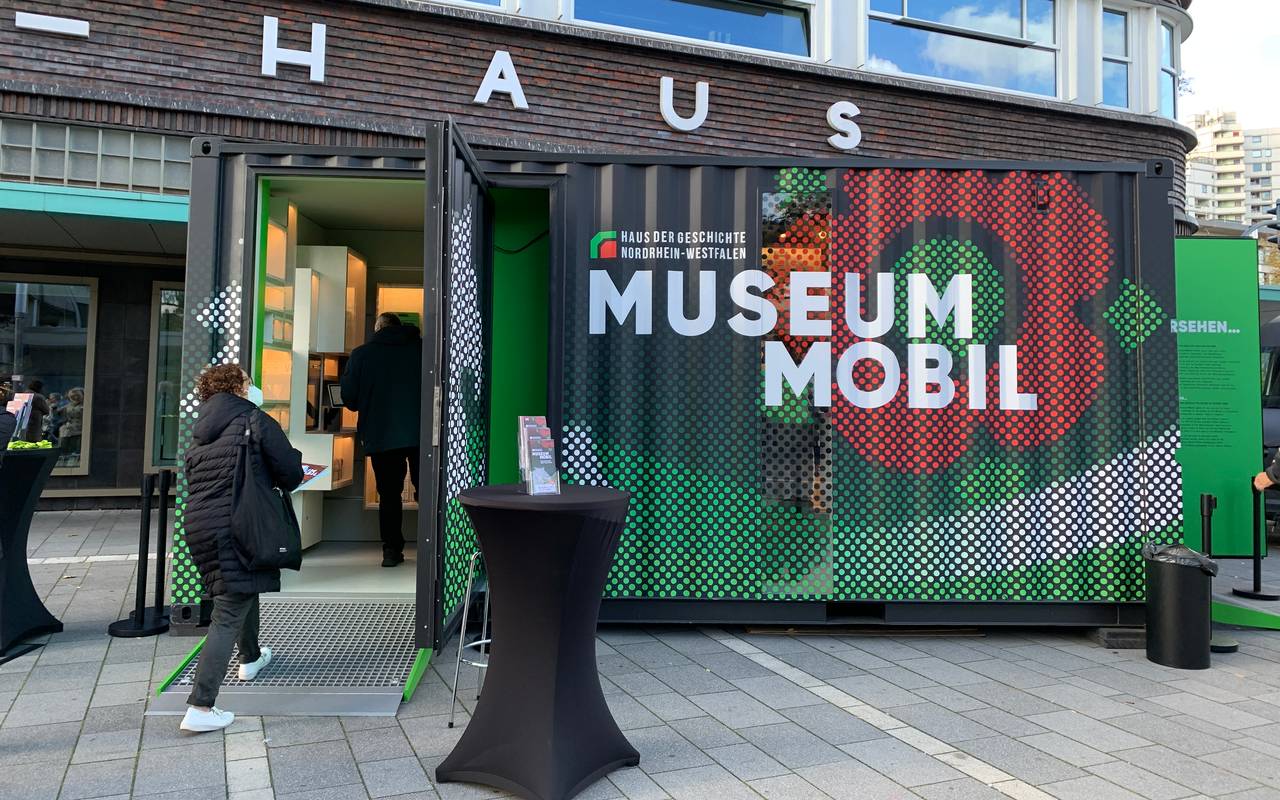 Seit heute steht das Mobil-Museum in Form eines Containers vor dem Hans-Sachs-Haus in der Innenstadt. Bis zum 13. November wird dort die NRW-Geschichte erzählt – von der Landesgründung bis heute.