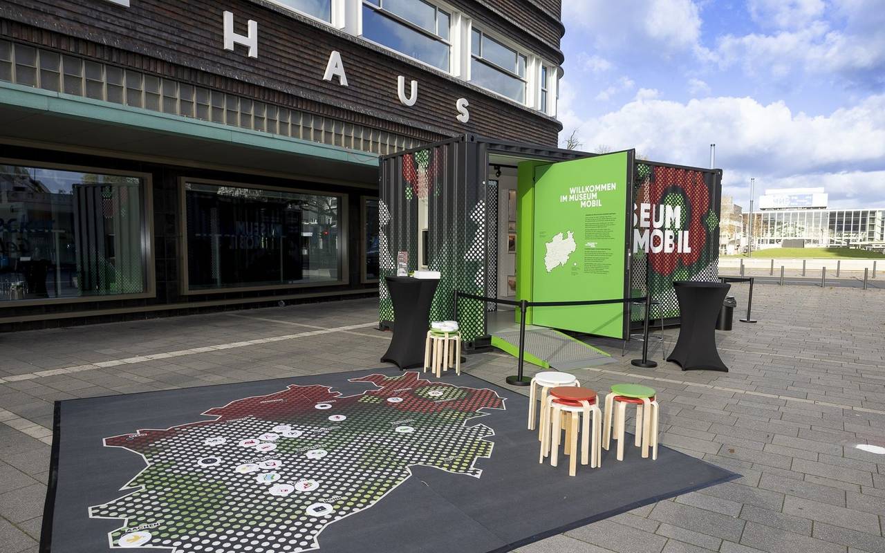 Im mobilen Museum vor dem Hans-Sachs-Haus könnt ihr heute Erinnerungen zur NRW-Geschichte abgeben.