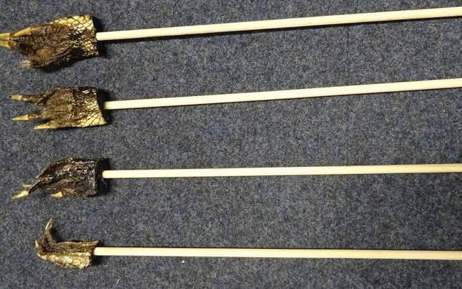 Das Zollamt Gelsenkirchen hat in einem Postpaket einen kuriosen Fund gemacht: vier Füße eines Alligators, präpariert auf Holzstöcken.
