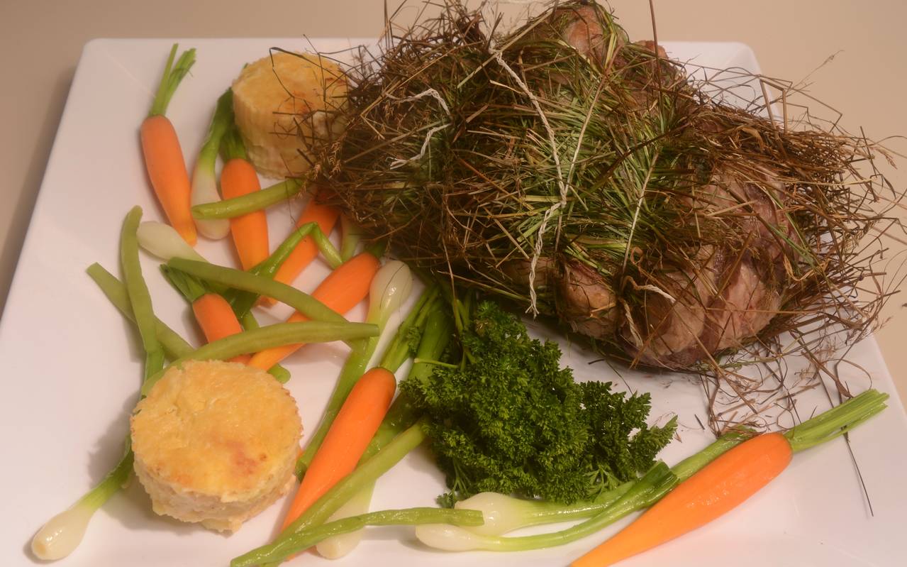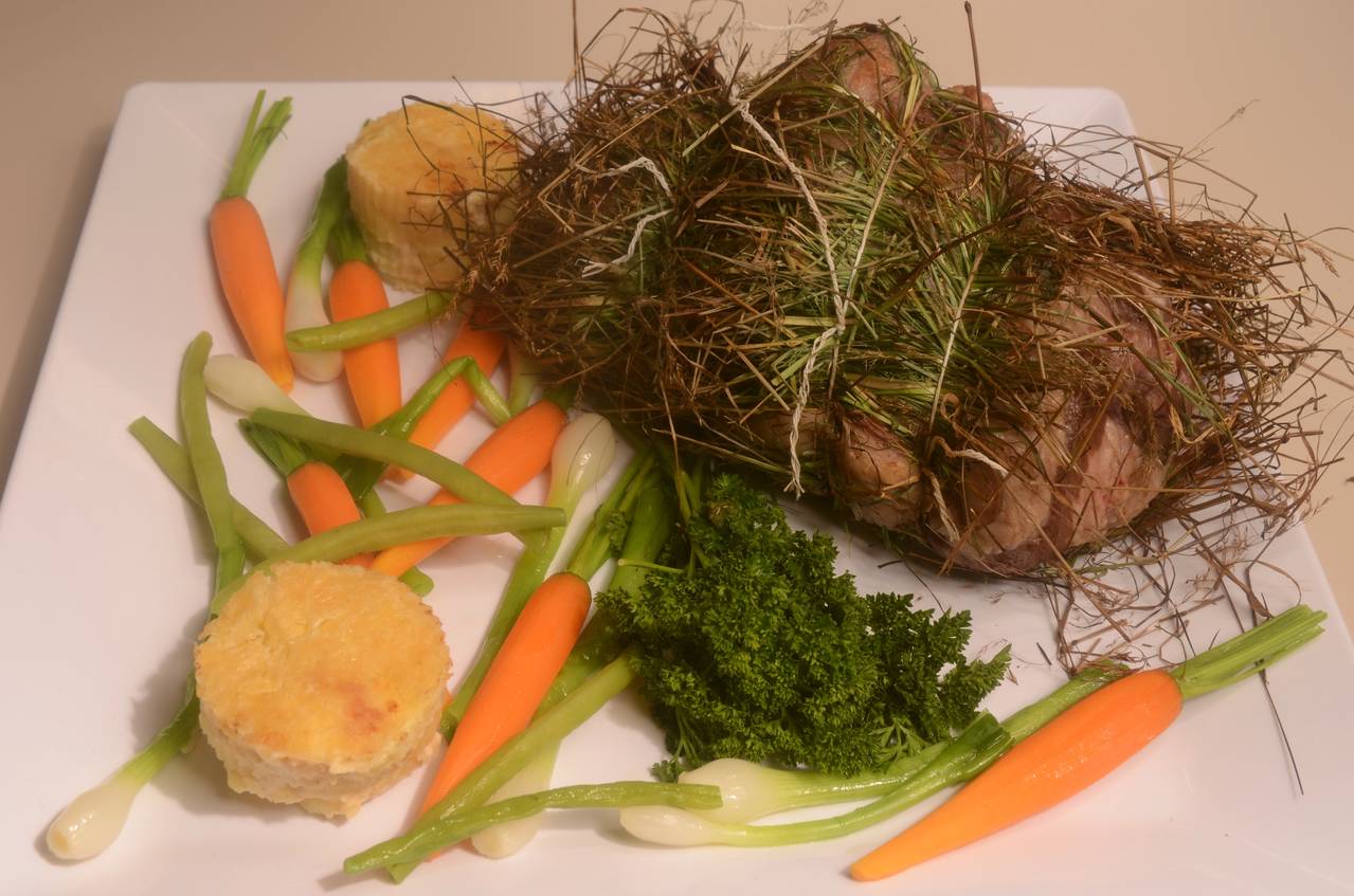 Lammkeule im Wiesenheu mit Kartoffelgratin & Frühlingsgemüse