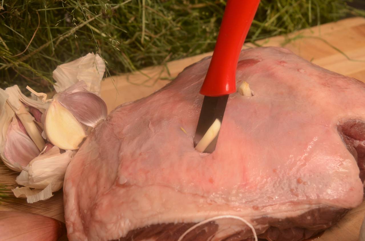 Die Lammkeule mit dem Knoblauch spicken, anschließend salzen und pfeffern. Das Wiesenheu gut waschen, ausbreiten und die Lammkeule darauflegen. Das Wiesenheu überschlagen und die Lammkeule ganz damit bedecken. Nun das Heu mithilfe von Küchengarn festbinden. Den Backofen auf 180 Grad vorheizen und die Lammkeule auf der zweiten Schiene von unten eine Stunde garen.