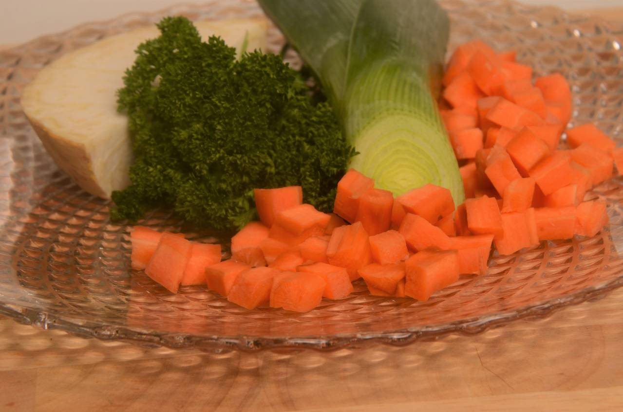 Das Gemüse putzen und danach nacheinander in kochendem Salzwasser garen. In einem Topf die Butter schmelzen und das Gemüse darin erhitzen und abschmecken. Auf einer vorgewärmten Platte die Keule mit den Kartoffeln und dem Gemüse anrichten. Zuletzt die Soße durch einen Sieb geben und alles anrichten.