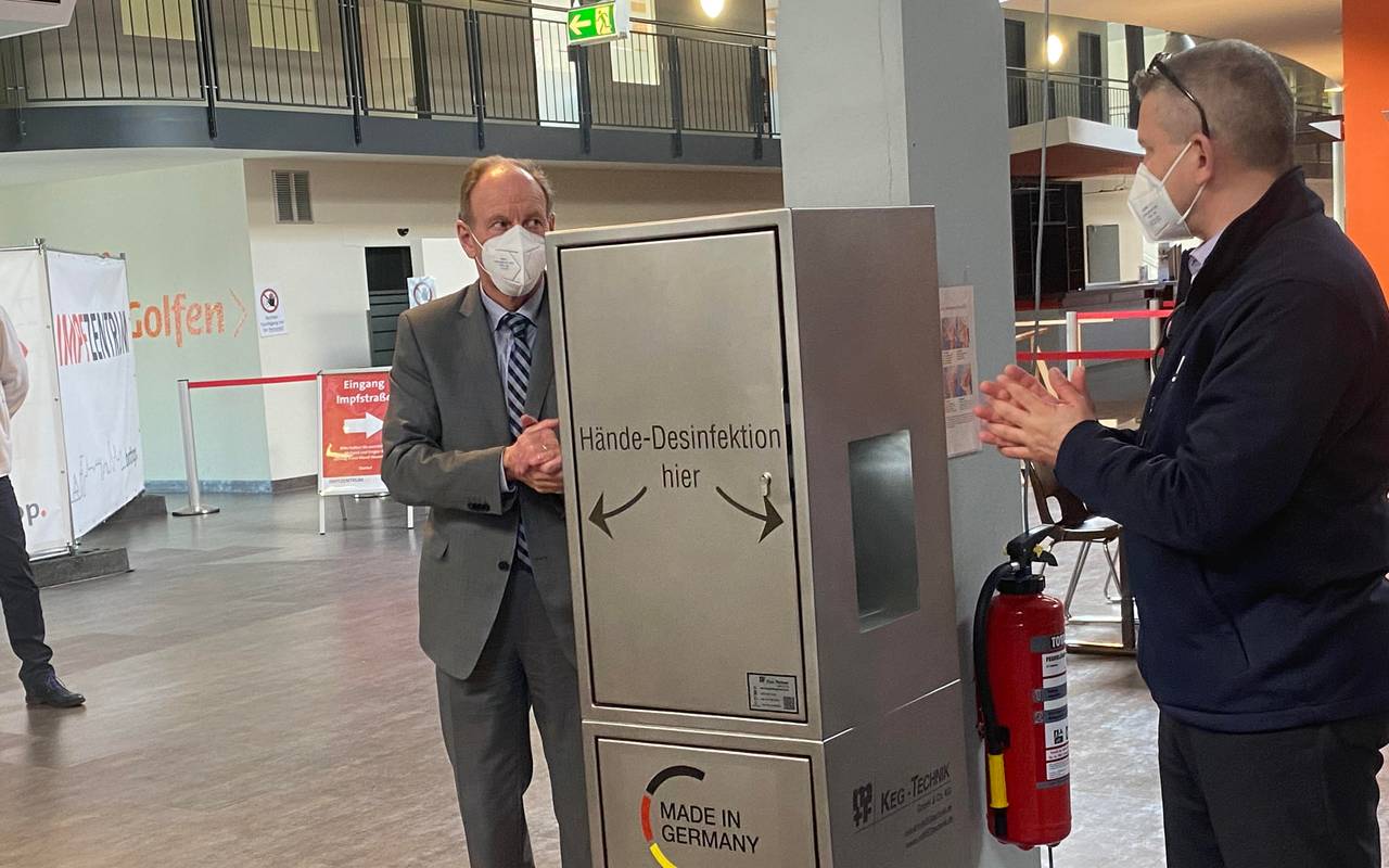 Im Bottroper Impfzentrum gibt es seit heute neuartige Spender für Handdesinfektionsmittel. Die Bottroper Firma m+f KEG-Technik baut die Desinfektionsschränke. Die Firma setzt vor allem auf Nachhaltigkeit. Da das Mittel aus wiederbefüllbaren Fässern kommt, fällt kein Plastikmüll an. Außerdem seien die Schränke gegen Einbruch und Diebstahl gesichert. An den Spendern können sich gegenüber zwei Leute gleichzeitig die Hände desinfizieren. Auch das Riesener-Gymnasium in Gladbeck setzt auf die neuen Spender aus Bottrop.