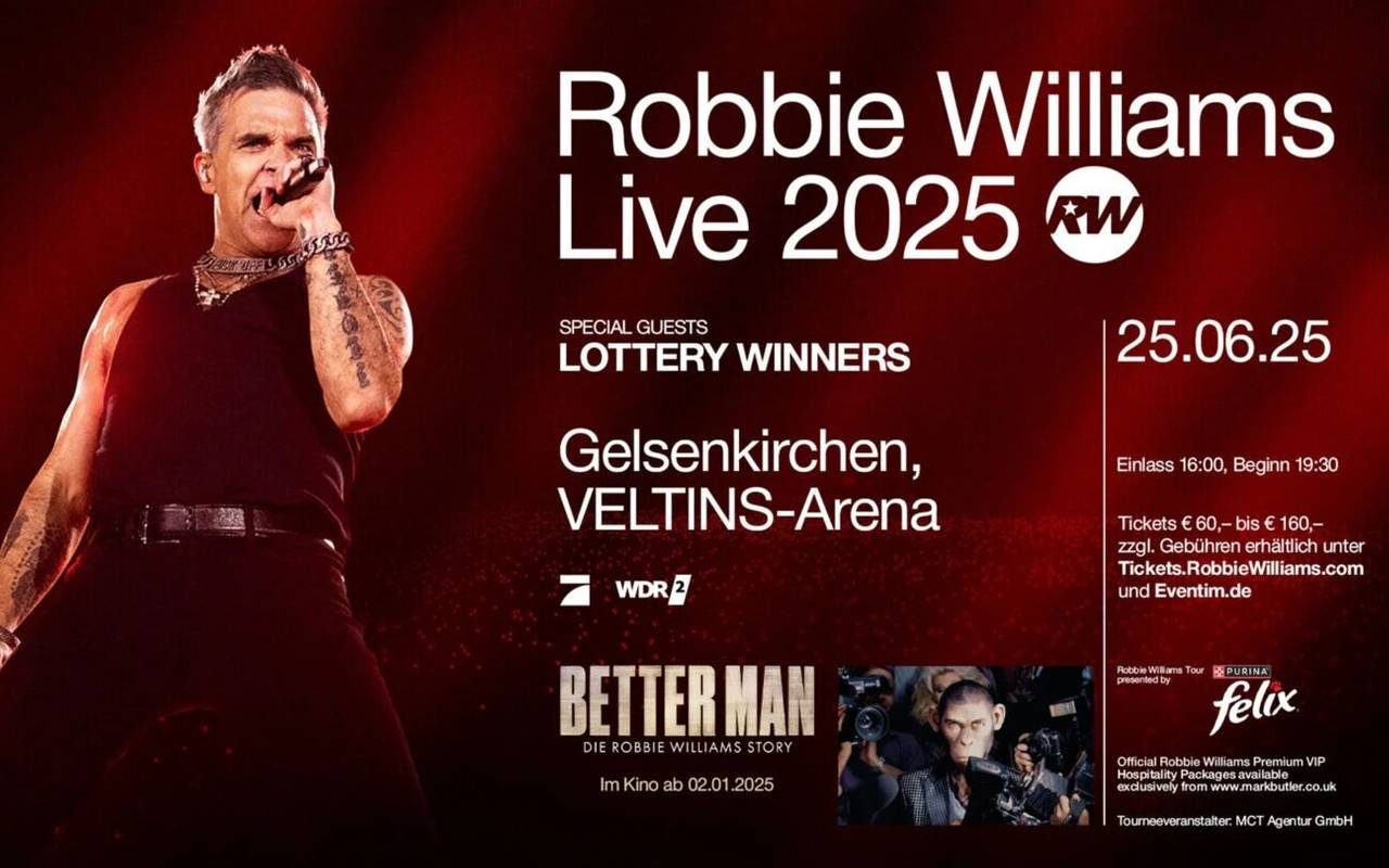Robbie Williams stand schon dreimal auf der Bühne der Veltins-Arena - zweimal 2003 und einmal 2013. Das Konzert 2025 steigt nur zwei Tage vor der Show von US-Star Bruce Springsteen auf Schalke. Außerdem spielen im kommenden Jahr Iron Maiden und PUR in der Gelsenkirchener Arena.