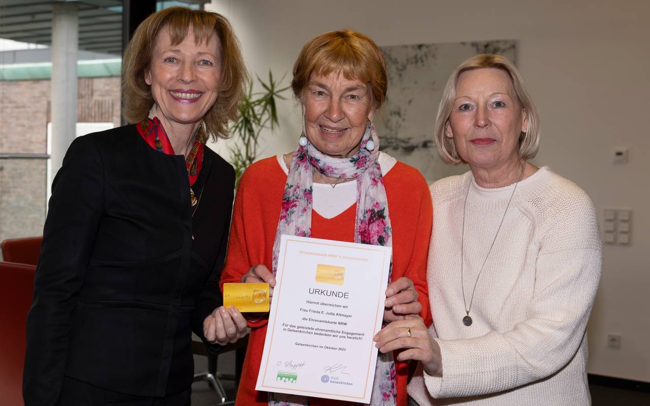 Über 1.500 Gelsenkirchener setzen sich in ihrer Freizeit ohne Bezahlung für andere Menschen oder für die Umwelt ein. Oberbürgermeisterin Karin Welge hat gestern im Hans-Sachs-Haus die 1.500. Ehrenamtskarte übergeben. Sie ging an Jutta F. Altmayer. Die 80-jährige Gelsenkirchenerin engagiert sich in gleich mehreren Projekten ehrenamtlich.