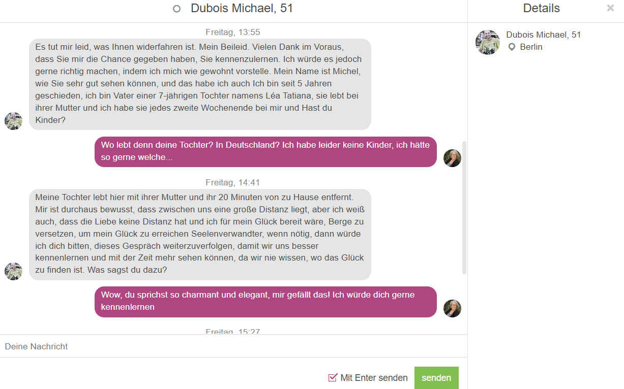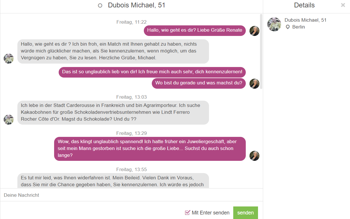 Michael Dubois heißt in Wirklichkeit anders. Und er lebt auch nicht in Carderousse in Frankreich, wie in seinem Profil steht. Er arbeitet auch nicht als Agrarimporteur für Schokoladenfirmen, wie er erzählt. Und vor allem will er Renate nicht kennenlernen. Er will ihr Geld. Hinter "Michael Dubois" steckt mit hoher Wahrscheinlichkeit ein Liebesbetrüger aus Westafrika. Die Betrüger gaukeln Alleinstehenden die große Liebe im Internet vor - zu einem Treffen kommt es nie. Stattdessen versuchen die Abzocker, ihre Opfer unter einem Vorwand dazu zu bringen, ihnen Geld zu schicken.