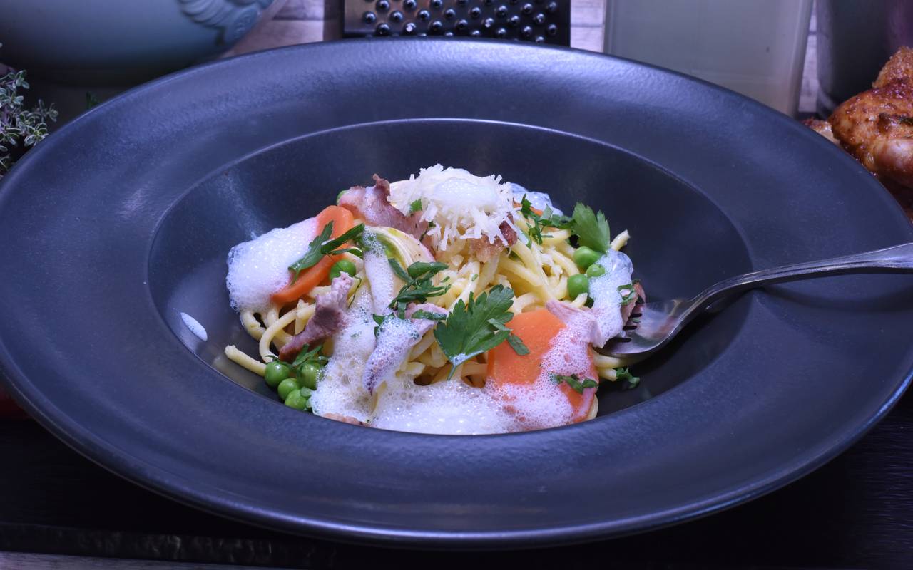 Spaghetti Carbonara mit gebratener Schweineschulter