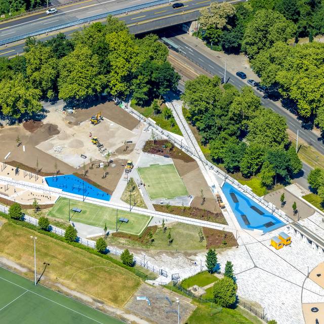 Der neue Sportgarten an der Glückauf-Kampfbahn in Gelsenkirchen Schalke-Nord nimmt Formen an. Der erste von zwei Bauabschnitten ist fertig, meldet die Stadt. Auf der Fläche zwischen Kurt-Schumacher-Straße und Stadion ist eine grüne Promenade entstanden - unter anderem mit einem Trinkwasserbrunnen. Auch das Ehrenmal mit den markanten Bäumen wurde auf Vordermann gebracht.