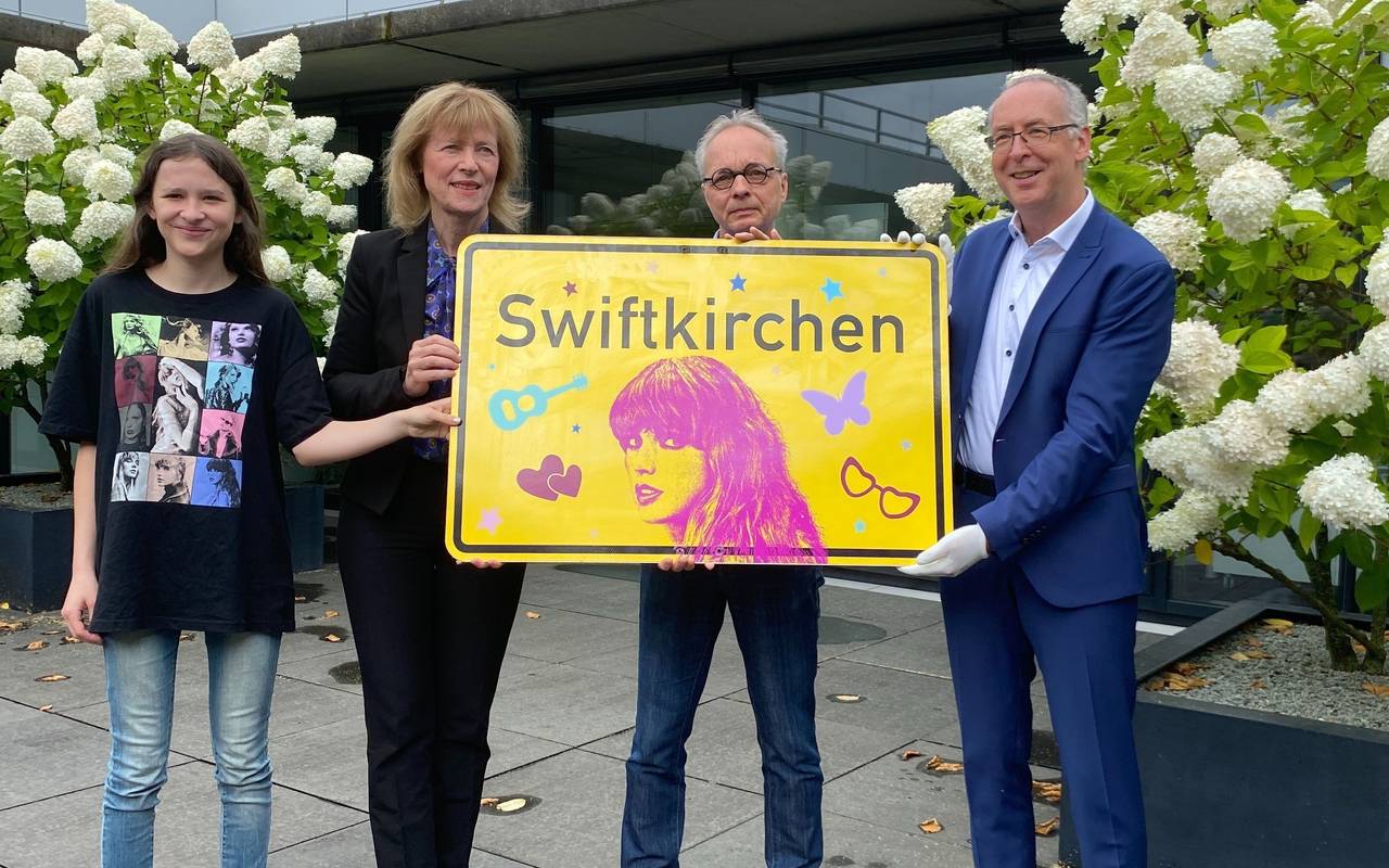Die 16-jährige Schülerin Aleshanee Westhoff hatte die Idee, die Stadt während der drei Konzerte von US-Megastar Taylor Swift umzubenennen. Und ihre Idee kam gut an - Oberbürgermeisterin Karin Welge war begeistert und ließ Ortsschilder designen, Stadtgrafiker Uwe Gelesch hat mit grafischen Pop-Art-Elementen das Schild erstellt. Zu sehen sind eine Sonnenbrille in Herzform, eine Gitarre, ein Schmetterling, Herzen, Sterne und in der Mitte ein Bild der Sängern. Die Schilder fanden weltweit in den sozialen Medien großen Anklang.