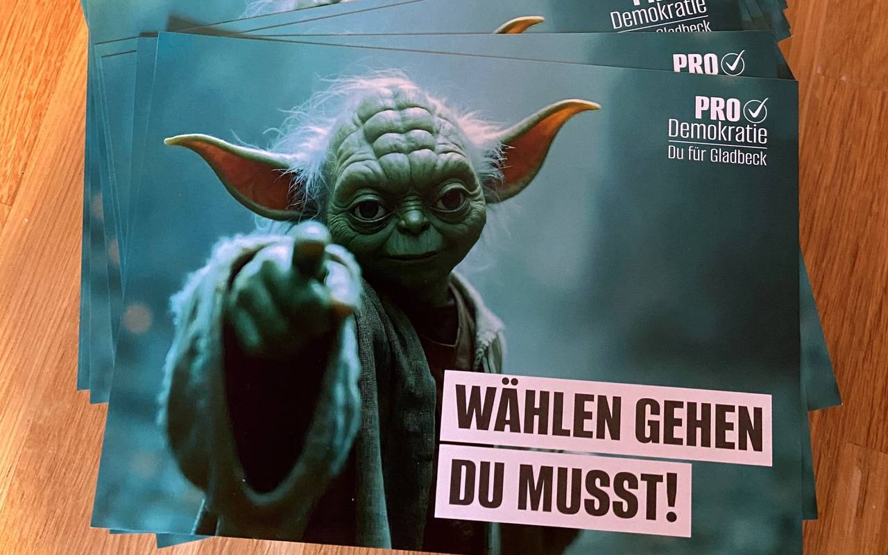Die Initiative ProDemokratie verteilt an euch Gladbecker im Moment Postkarten, auf denen Yoda von Star Wars zu sehen ist und sagt: "Wählen gehen du musst!"