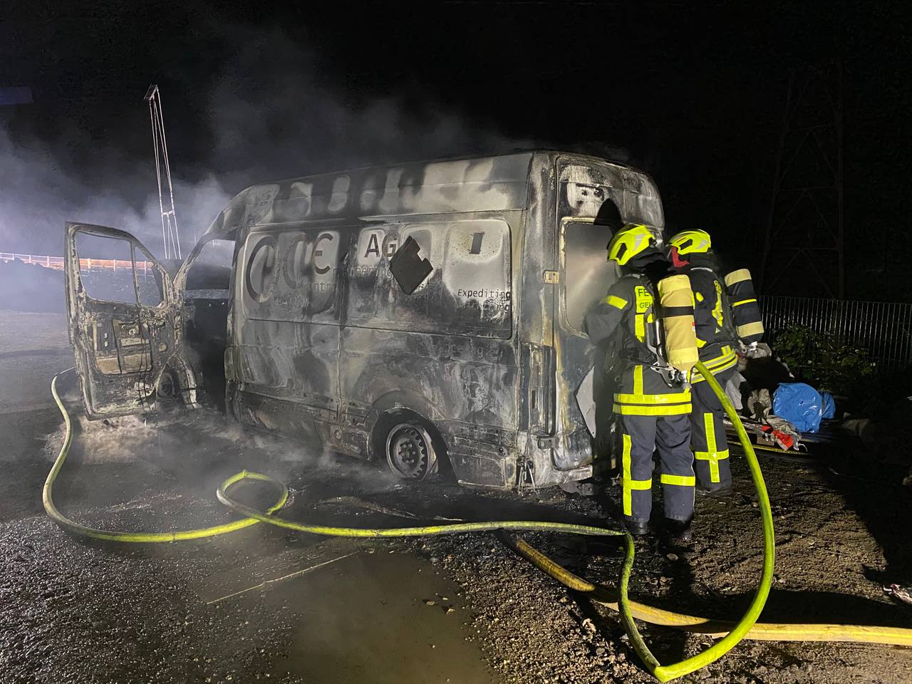 Die letzten Fahrzeuge waren gerade vom Einsatz am Dördelmannshof eingerückt, als es einen weiteren Alarm für die Gelsenkirchener Feuerwehr gab. Um kurz nach 1 Uhr meldete ein nächtlicher Spaziergänger ein brennendes Zelt auf dem weitläufigen BUGA-Gelände in Horst. Vor Ort stellte sich heraus, dass auf dem Emscher-Deich in der Nähe des Amphitheaters ein Kleintransporter brannte. Die Flammen hatten das komplette Fahrzeug zerstört.